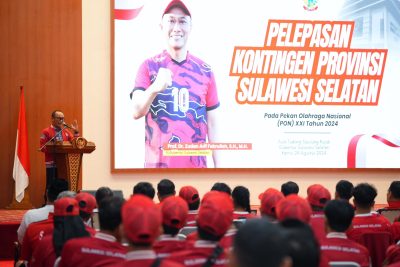 MAKASSAR, KORANMAKASSAR.COM — Sebanyak 630 orang kontingen Sulsel yang akan berangkat menuju ke arena Pekan Olahraga Nasional (PON) ke XXI di Aceh-Sumatera Utara dilepas secara resmi oleh Penjabat Gubernur Sulawesi Selatan, Prof Zudan Arif Fakrulloh di Aula Tudang Sipulung, Rumah Jabatan Gubernur Sulsel, Kamis malam, 29 Agustus 2024.