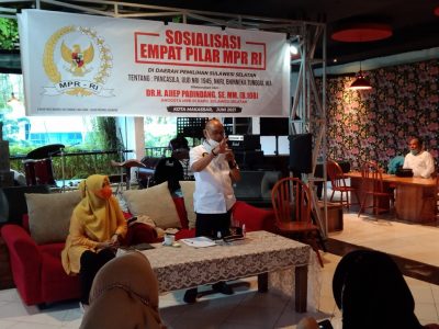 MAKASSAR, KORANMAKASSAR.COM — “Terjadi pemahaman yang lemah di kalangan generasi muda terhadap penghayatan dan pengamalan Pancasila”. Hal tersebut disampaikan anggota MPR RI Dr. H. Ajiep Padindang, SE, MM. saat melaksanakan sosialisasi Empat Pilar MPR RI di Kota Makassar dengan segmen mahasiswa dan tokoh pemuda di La Buana Café & Resto jl. Urip Sumoharjo Kota Makassar, kamis (24/6/2021).