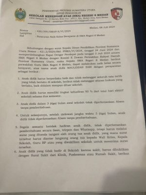 Di dalam surat bernomor : 420/399/SMAN 8/VI/2024 yang berisi 16 poin kesepakatan dijelaskan, sehubungan dengan surat Kepala Dinas Pendidikan Provinsi Sumatera Utara Nomor : 421.3/5029/Bid.PSMA/VI/2024 tanggal 24 Juni 2024 dan mempertimbangkan Rapat Dengar Pendapat pada tanggal 3 Juli 2024 antara Komisi SMA Negeri 8 Medan dengan Komisi E DPRD Sumatera Utara, maka Kepala SMAN 8 Medan dan perwakilan guru, dapat melakukan naik kelas bersyarat atas nama anak didik Maulidzah Sari dengan persyaratan sebagai berikut :