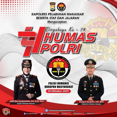 MAKASSAR, KORANMAKASSAR.COM — Kapolres Pelabuhan Makassar AKBP Rise Sandiyantanti menyampaikan ucapan selamat Dirgahayu ke-74 Humas Polri, yang diperingati pada 30 Oktober 2025.
