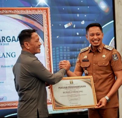 MAKASSAR, KORANMAKASSAR.COM — Bupati Enrekang H. Muh. Yusuf Ritangnga menerima penghargaan dari Menteri Hukum dan Hak Asasi Manusia (HAM) RI atas komitmen Pemerintah Kabupaten Enrekang dalam membentuk Pos Bantuan Hukum (Posbakum).