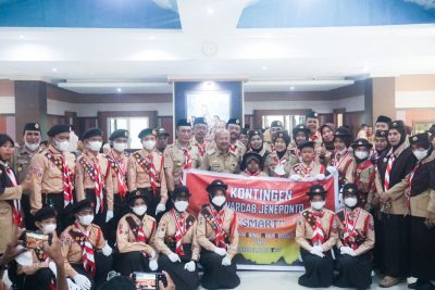 JENEPONTO, KORANMAKASSAR.COM — Bupati H. Iksan Iskandar bersama forum komunikasi pimpinan daerah (Forkopimda) secara resmi melepas 16 orang peserta Jambore Nasional diruang Pola Panrannuangta senin. (01/08/2022)