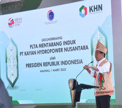 Demikian disampaikan Presiden Jokowi dalam sambutannya saat melakukan peletakan batu pertama (groundbreaking) PLTA Mentarang Induk PT Kayan Hydropower Nusantara, di Kabupaten Malinau, Provinsi Kalimantan Utara, pada Rabu, 1 Maret 2023.