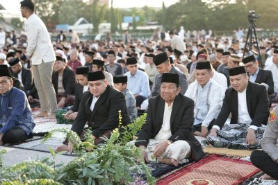 Area beton lapangan yang luas berubah menjadi lautan jemaah, menghadirkan suasana khidmat sekaligus penuh kehangatan, sebuah momen yang merefleksikan persatuan, kesederhanaan, dan kebersamaan di hari yang suci.