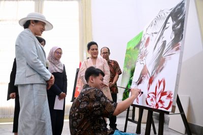 Sementara Presiden Jokowi dan Kaisar Naruhito mengadakan pertemuan empat mata atau tête-à-tête, Ibu Iriana mengajak Permaisuri Masako untuk menyaksikan pelukis difabel Benediktus Anfield melukis ikan koi.