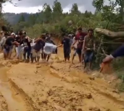 Warga terpaksa menjemput dan menggotong jenazah salah satu warga Simbuang–Mappak yang dipulangkan dari Makassar menuju kampung halaman akibat kerusakan parah pada akses jalan yang tidak dapat dilalui kendaraan.
