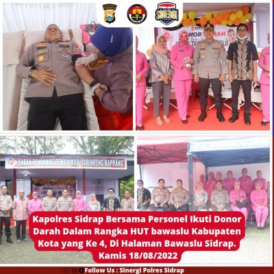Kapolres Sidrap AKBP Erwin Syah S.I.K mengatakan bahwa, selain membantu apa yang menjadi kebutuhan mendesak bagi masyarakat, donor darah juga merupakan kegiatan sinergitas antara Polres Sidrap dengan Bawaslu yang selalu saling mensupport dalam kegiatan positif.