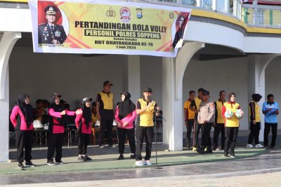 SOPPENG, KORANMAKASSAR.COM — Sambut HUT Bhayangkara ke 78, Polres Soppeng menggelar pertandingan Bola Volly antar Satker dan Polsek jajaran bertempat di Lapangan Gasis Soppeng jl. Kesatria Kel. Botto Kec. Lalabata Kabupaten Soppeng, Kamis (20/6/24).