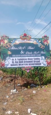 TANAH BUMBU, KORANMAKASSAR.COM — Keluarga besar H. Rusdi makin kebahagiaannya makin lengkal pasalnya Wakil Menteri Kehutanan RI, Hj. Andi Arinawati Arsyad mengirim karangan bunga ucapan di pernikahan anak lelakinya bernama Akbar yang resmi mempersunting Dinda Khaerani.