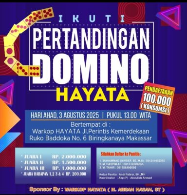 MAKASSAR, KORANMAKASSAR.COM — Dalam rangka menyemarakkan Hari Ulang Tahun (HUT) Kemerdekaan Republik Indonesia ke-80, Komunitas Pencinta Kopi Warkop HAYATA akan menggelar Turnamen Domino pada 3 Agustus 2025.