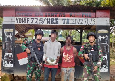 BOVEN DIGOEL, KORANMAKASSAR.COM — Kembali terjadi, anggota Satgas Pamtas RI-PNG Yonif 725/Wrg Pos KM 53 di bawah naungan Kolakops Korem 174/ATW berhasil menangkap dua pemuda membawa Narkoba jenis ganja seberat 354 Gr di Kampung Kanggup, Distrik Sesnuk, Kab. Boven Digoel, Papua Selatan. Minggu (16/4/2023).