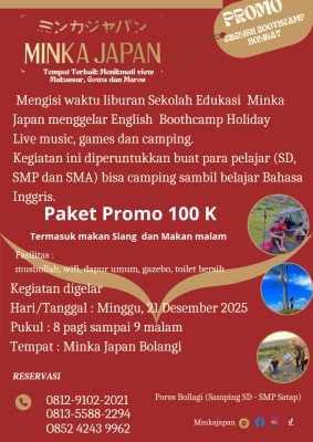 MAKASSAR, KORANMAKASSAR.COM — Tempat wisata Rumah Rempah Minka Japan menghadirkan program English Bootcamp bagi pelajar untuk mengisi libur sekolah. Kegiatan ini akan berlangsung mulai 21 hingga 30 Desember dengan konsep belajar bahasa Inggris yang interaktif di tengah suasana alam pegunungan.