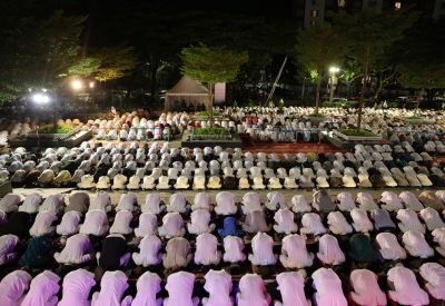 Ribuan warga tampak antusias mengisi shaf jemaah salat Subuh. Barisan jemaah memadati sayap kiri dan kanan anjungan City of Makassar.