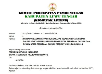 JAKARTA, KORANMAKASSAR.COM — Komite Percepatan Pembentukan Kabupaten Luwu Tengah (KOMPPAK Luteng) secara resmi mengajukan keberatan administrasi hukum kepada Presiden Republik Indonesia, Prabowo Subianto, terkait belum diterbitkannya Peraturan Pemerintah (PP) Penataan Daerah dan Desain Besar Penataan Daerah sebagaimana amanat Undang-Undang Nomor 23 Tahun 2014 tentang Pemerintahan Daerah.
