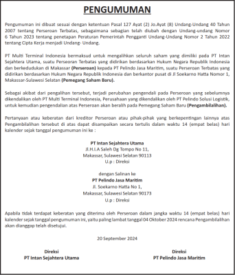 PENGUMUMAN PENGAMBILALIHAN SAHAM PT INTAN SEJAHTERA UTAMA DARI PT MULTI TERMINAL INDONESIA KE PT PELINDO JASA MARITIMReporter Koma20 September 202430 September 2024BERITA