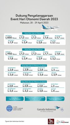 “Garuda Indonesia menyiapkan promo spesial sebagai wujud dukungan kesuksesan Hari OTDA 2023. Beberapa promo yang dipersiapkan adalah harga spesial penerbangan ke/dan dari Makassar dan harga spesial kelebihan bagasi mulai dari Rp22 ribu,” kata Nini, Minggu, (16/04/2023).