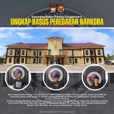 TORAJA UTARA, KORANMAKASSAR.COM — Satresnarkoba Polres Toraja Utara Polda Sulsel berhasil mengungkap kasus peredaran narkoba jenis sabu pada 3 lokasi yang berbeda di Wilayah Kabupaten Toraja Utara.