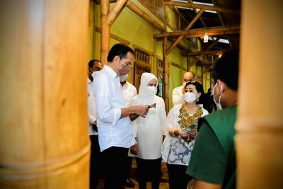 Di sini, Presiden dan Ibu Iriana melihat rumah bambu lestari, beragam produk bambu, termasuk sepeda bambu yang disebut Spedagi.