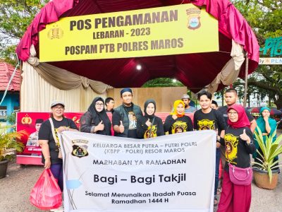 Para pengurus dan anggota KBPP POLRI Maros tampak bersemangat membagikan takjil ke pengguna jalan yang melintas. Para pengguna jalan begitu antusias untuk mendapatkan takjil dari anak – anak polisi, sehingga seluruh takjil yang berjumlah 100 kotak yang disiapkan habis tak tersisa.