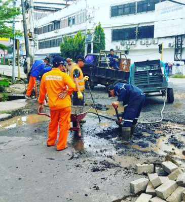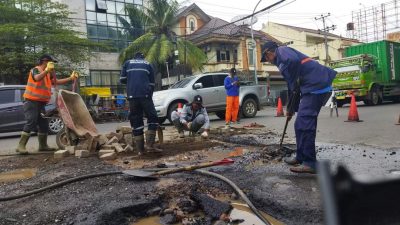 MAKASSAR, KORANMAKASSAR.COM — Adanya pengaduan dari masyarakat membuat Dinas Pekerjaan Umum (DPU) Kota Makassar segera menurunkan armadanya beserta 10 orang personil untuk melakukan perbaikan ruas jalan di Jalan Cakalang, pertigaan traffict light Yos Sudarso, Minggu, (06/02/2022).