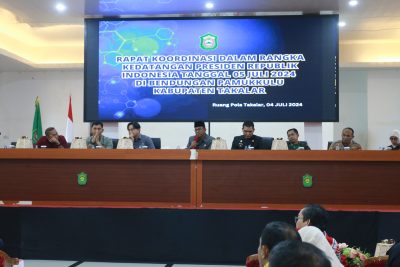 TAKALAR, KORANMAKASSAR.COM — Pj Bupati Takalar Dr. Setiawan Aswad, M.Dev.,Plg memimpin rapat koordinasi persiapan kedatangan Presiden Republik Indonesia Ir. Joko Widodo beserta Ibu Negara di kabupaten Takalar. Rapat berlangsung di Ruang Pola Kantor Bupati Takalar. Kamis, 4 Juli 2024.