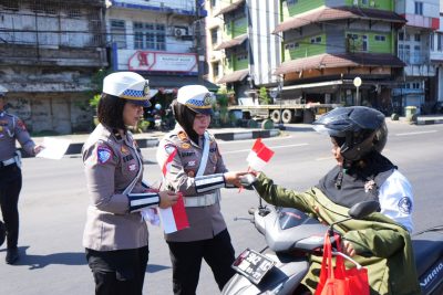 Selain membagikan bendera, personel Sat Lantas juga menyisipkan pesan-pesan edukatif tentang pentingnya mematuhi rambu lalu lintas dan berkendara dengan aman demi keselamatan bersama.