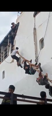 MAKASSAR, KORANMAKASSAR.COM — Aksi sejumlah pemuda yang diduga pedagang asongan yang hendak naik kapal penumpang dengan menggunakan tali, yang terjadi di Pelabuhan Soekarno Hatta Kota Makassar, kejadian tersebut videonya viral di media sosial