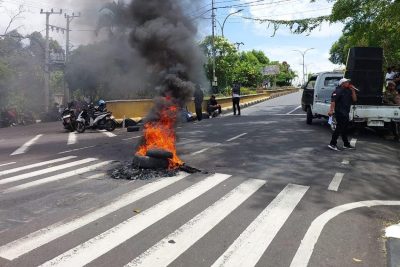 Pendemo juga tampak membentangkan spanduk yang bertuliskan 3 tuntutan di pagar kantor Wali Kota, serta mereka juga tampak membakar ban di tengah jalan.