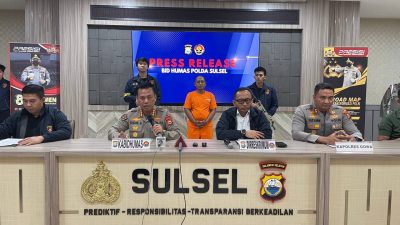 Kabid Humas Polda Sulsel Kombes Pol Didik Supranoto, yang di dampingi Dirkrimum Kombes Pol Setiadi Sulaksono dan Kapolres Gowa AKBP Muhammad Aldi Sulaiman, saat Press Release di aula Mapolda Sulsel, Jalan Perintis kemerdekaan Kota Makassar, Selasa (8-7-2025) siang tadi
